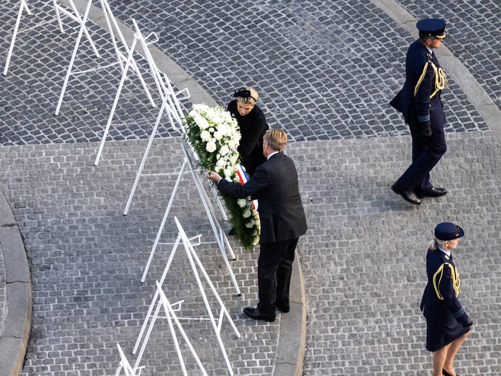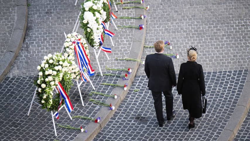 Koning Willem-Alexander en koningin Máxima legden vlak voor de twee minuten stilte de eerste krans.
