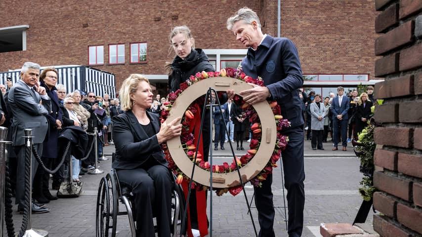 De Amsterdamse burgemeester Femke Halsema en wethouder Rutger Groot Wassink leggen namens Amsterdam een krans. Vorige week bood Halsema namens de gemeente excuses aan voor de rol van Amsterdam bij de Jodenvervolging tijdens de Tweede Wereldoorlog.