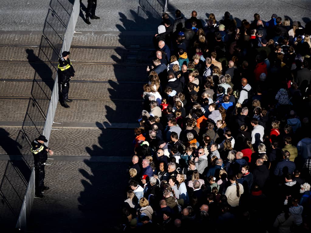 De Dam is intussen aardig volgestroomd. Langs de vrijgehouden baan, waarover koning Willem-Alexander zo naar het monument loopt, staat het rijendik. Daarachter is nog wel ruimte.