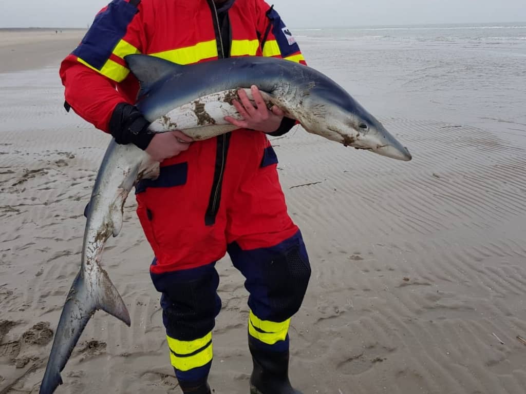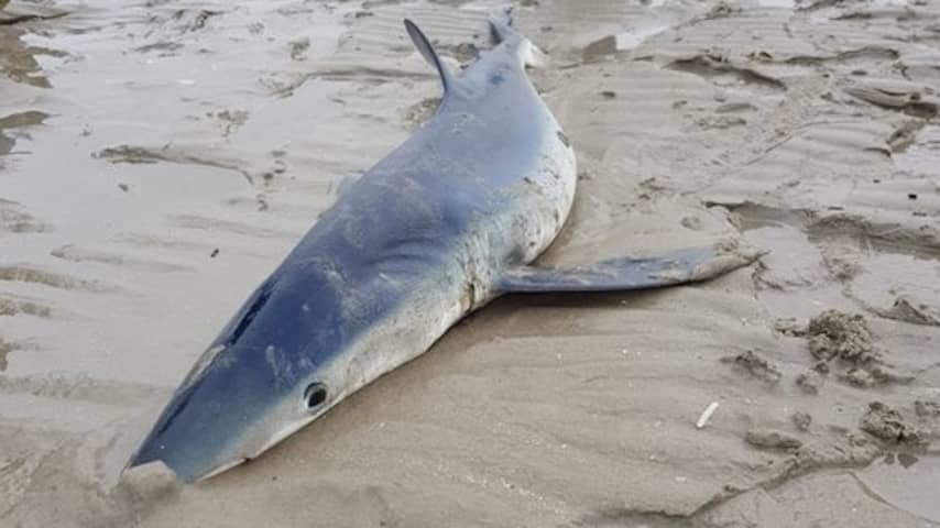 Levende blauwe haai aangespoeld op strand bij Ouddorp