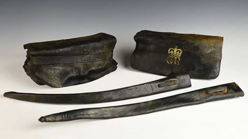 De kanonnen werden overboord gegooid als laatste poging om het schip lichter te maken en te redden, maar die poging bleek tevergeefs. De patroontassen zijn bedrukt met het wapen van de toenmalige Engelse koning George III.