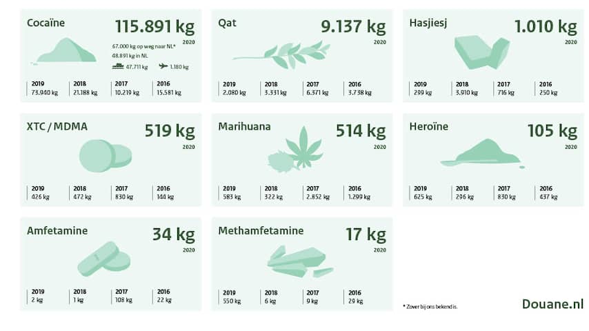 Op luchthaven Schiphol ging het om een totaal van 1.180 kilo cocaïne. Daarnaast werden duizenden postpakketten en brieven met drugs onderschept, waarvan bijna drieduizend met uit Nederland afkomstige synthetische drugs.