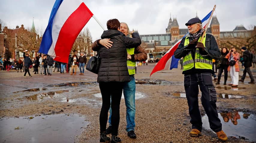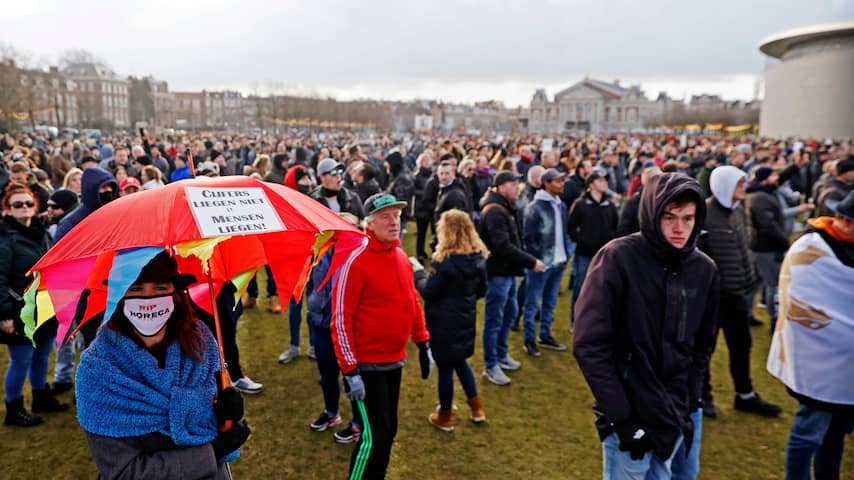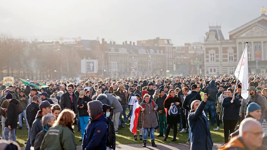Desondanks beginnen tientallen actievoerders zich te verzamelen op het Museumplein. De situatie is in het begin nog rustig. Er worden leuzen gescandeerd, maar de sfeer is over het algemeen nog gemoedelijk. Wel is duidelijk dat demonstranten onderling geen afstand houden. | Beeld: ANP