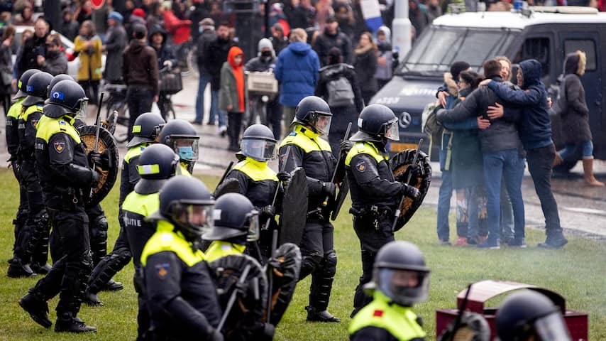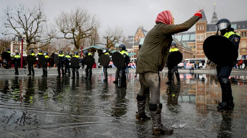 Om 15.00 uur is het geduld van de driehoek op. De politie krijgt de opdracht om het Museumplein, met daarop zo'n tweeduizend demonstranten, "leeg te vegen". | Beeld: ANP