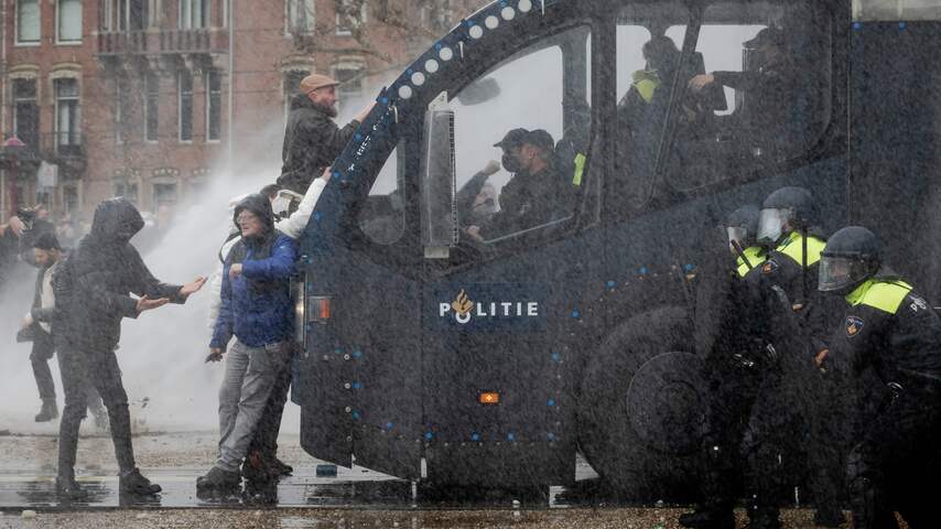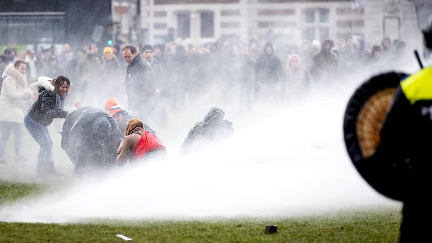 Een deel van de betogers kiest eieren voor zijn geld en vertrekt. Toch blijft een aanzienlijke groep staan. De demonstranten die blijven, krijgen een nat pak. | Beeld: ANP