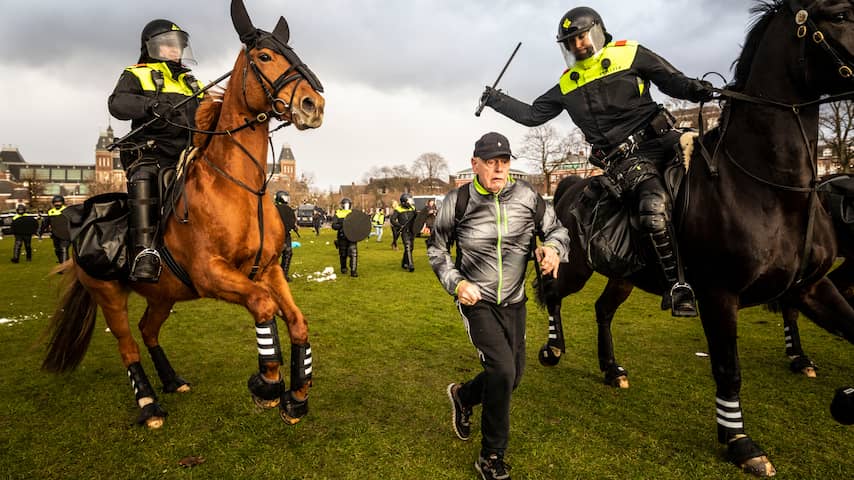 Er komen paarden aan te pas en de situatie escaleert. Sommige mensen krijgen rake klappen. Het lukt de ME al gauw om een groot deel van het Museumplein te ontruimen. | Beeld: ANP