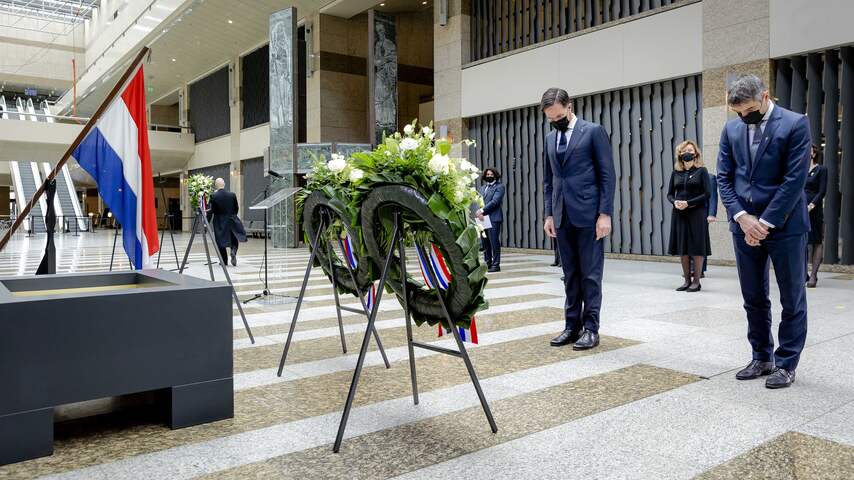 Demissionair premier Mark Rutte en staatssecretaris Paul Blokhuis (Volksgezondheid, Welzijn en Sport) legden een krans namens het demissionaire kabinet.