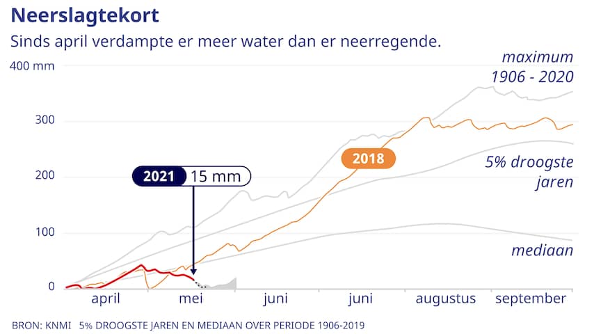 Dat blijkt ook uit het neerslagtekort dat door het KNMI wordt bijgehouden. Op dit moment bedraagt het neerslagtekort 15 millimeter en de verwachting is dat dit de komende dagen verder afneemt.