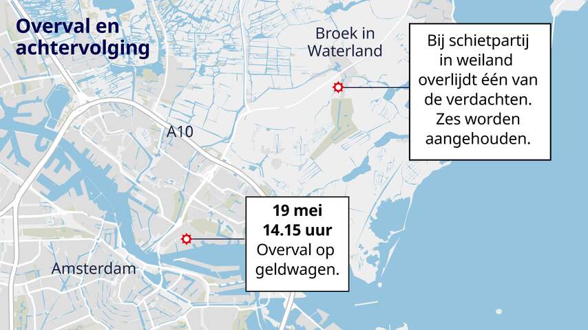 De overval op een waardetransport werd woensdagmiddag bij Schöne Edelmetaal aan de Meeuwenlaan in Amsterdam gepleegd en eindigde in Broek in Waterland, met een wilde achtervolging door de politie in een weiland. Daarbij werd over en weer geschoten, onder meer met de automatische wapens van de daders.