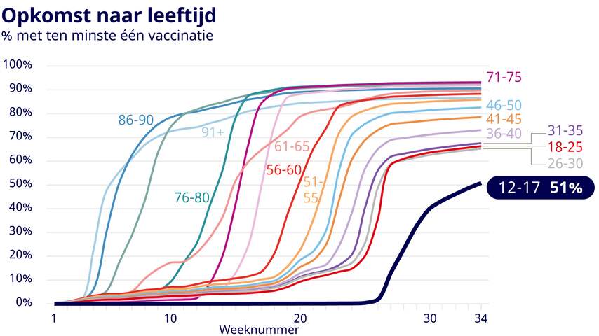 Van alle twaalf- tot achttienjarigen in Nederland heeft inmiddels 51 procent zeker één coronavaccin gekregen. Ruim een op de drie jongeren tot achttien jaar is volledig gevaccineerd.