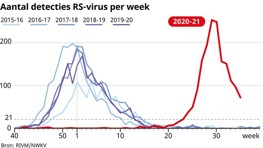 De verklaring is duidelijk: vanwege de coronamaatregelen kon het virus zich afgelopen winter niet verspreiden. Nu de kinderdagverblijven en basisscholen de deuren weer openen, geeft dat ook het virus weer ruimte om zich te verspreiden.