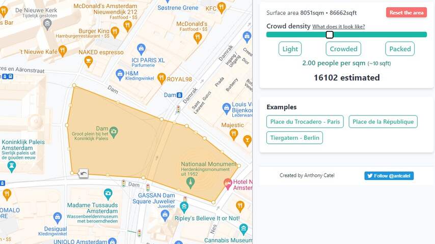 Ook kan hij invoeren hoeveel mensen er gemiddeld op een vierkante meter staan. Zondag waren dat gemiddeld twee personen per vierkante meter, zo vertelden videobeelden uit de stad en politieagenten op straat hem. Vervolgens rolde daar het getal van circa 16.000 mensen uit die op en rond de Dam stonden.