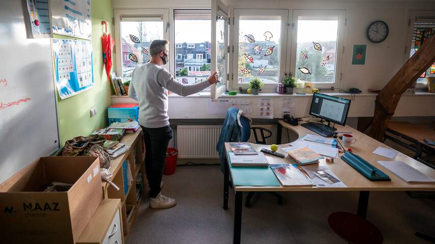 Een leerkracht van een basisschool in De Bilt opent een raam in een klaslokaal voor extra ventilatie. | Beeld: ANP