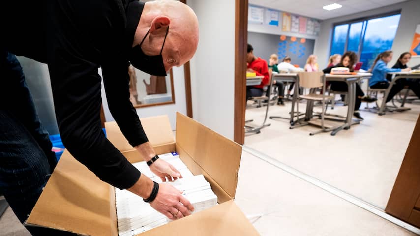 Dozen met coronazelftesten worden afgeleverd bij basisschool De Horizon in Harmelen. | Beeld: ANPMondkapje en twee keer per week een zelftest