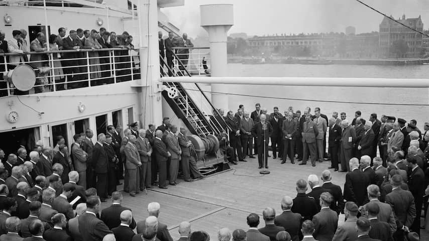 Verschillende beroemdheden reisden met de Holland-Amerika Lijn, onder wie Albert Einstein (de vijfde naam op de foto). | Beeld: Stadsarchief RotterdamLijn werd tijdens Tweede Wereldoorlog door geallieerden gebruikt
