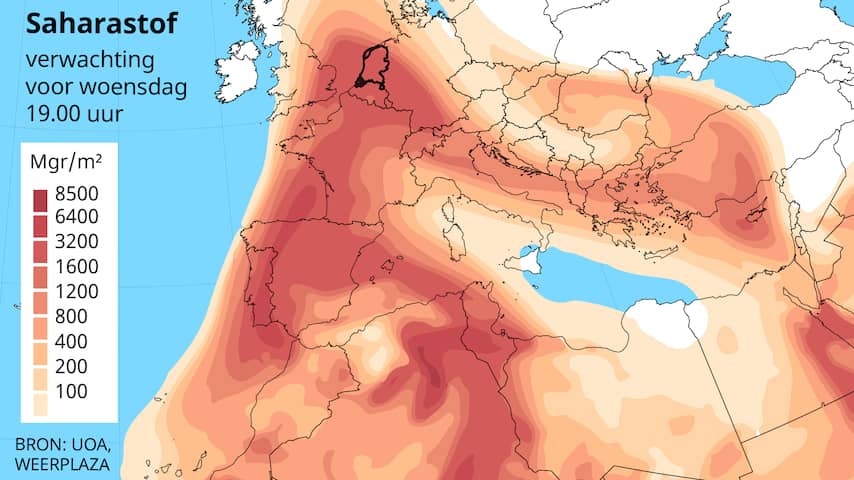 Vanaf dinsdag bereikt een 'wolk' van Saharastof de Nederlandse lucht. Vooral woensdag en donderdag kan de concentratie in de atmosfeer zo hoog zijn dat het meekomt met de verwachte regen. Als gevolg hiervan kan de zonsopkomst of -ondergang kleurrijker ogen dan normaal het geval is, doordat de stofdeeltjes de zon een oranje of rode waas geven. Dit komt doordat het stof het licht deels breekt en zo een deel van het kleurenspectrum tegenhoudt. Juist het rode licht is niet gevoelig voor het stof en bereikt makkelijker ons oog.