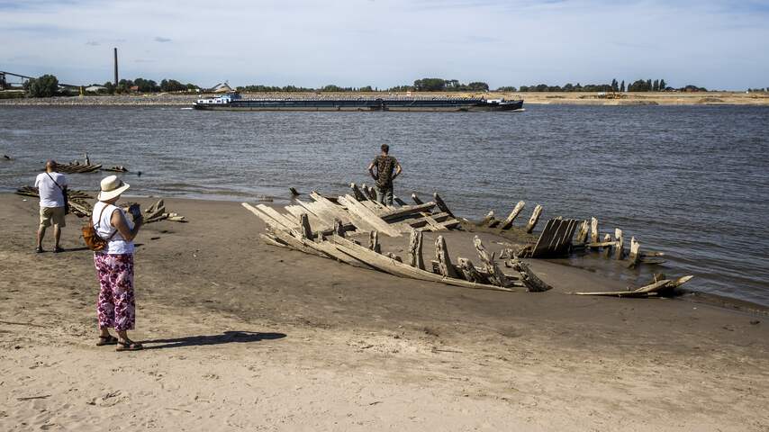 Het wrak van het in 1895 ontplofte dynamietschip Elisabeth is zichtbaar geworden. Dat komt door de lage waterstand in de Rijn ter hoogte van de Nederlands - Duitse grens bij Spijk en Tolkamer. | Beeld: ANP