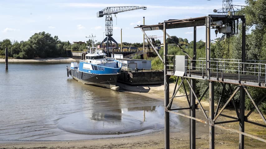 Een schip is door het lage water droog komen te liggen in de haven van Lobith. | Beeld: ANP