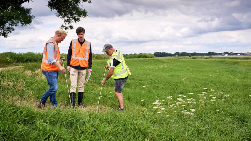 Een dijk langs de Rotte bij Zevenhuizen wordt geïnspecteerd. Verschillende waterschappen controleren de dijken extra op droogtescheuren, verzakkingen of andere schade. | Beeld: ANP