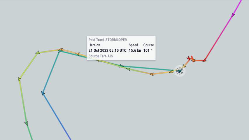 De laatste gegevens van de Tiger vóór ze snel vaart mindert. | Beeld: Marinetraffic.comVolgens de data van Marinetraffic voeren beide schepen er regelmatig te hard. De Stormloper voer afgelopen dagen met snelheden tot 45 kilometer per uur. Van de Tiger zijn soms snelheden van 55 kilometer per uur geregistreerd.