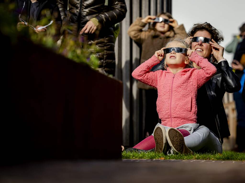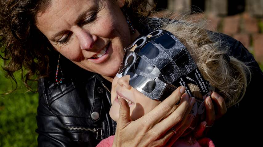 Je kan een (gedeeltelijke) zonsverduistering bekijken met een speciaal eclipsbrilletje. Het wordt absoluut afgeraden om direct de zon in te kijken. Dit meisje nam het zekere voor het onzekere. | Beeld: ANP