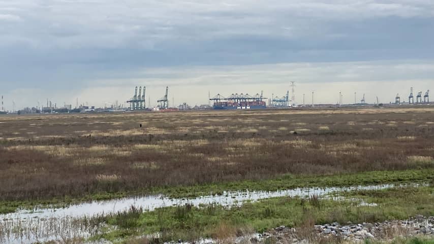 Iets verderop zijn graafmachines en andere voertuigen hard aan het werk in de polder. En daar weer achter varen grote containerschepen door de Westerschelde richting de haven van Antwerpen.