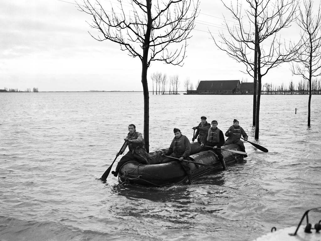 Grote stukken van Zeeland en Zuid-Holland kwamen in februari 1953 onder water te staan. | Beeld: ANPSchippers pikken mensen op