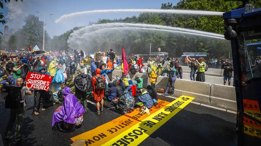 Actievoerders van Extinction Rebellion worden besproeid door de waterwerper 'op lage stand'. | Beeld: ANP