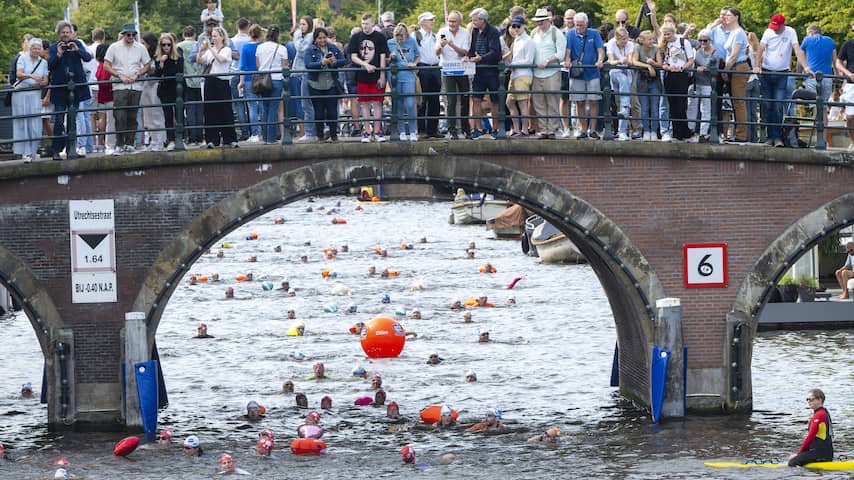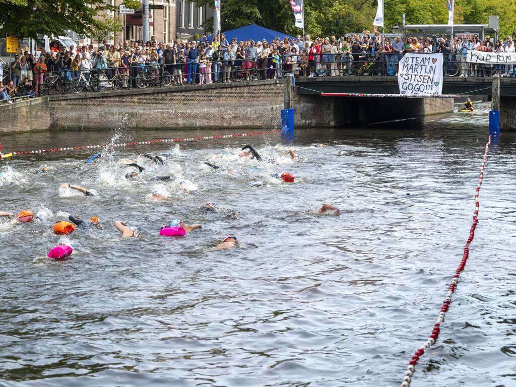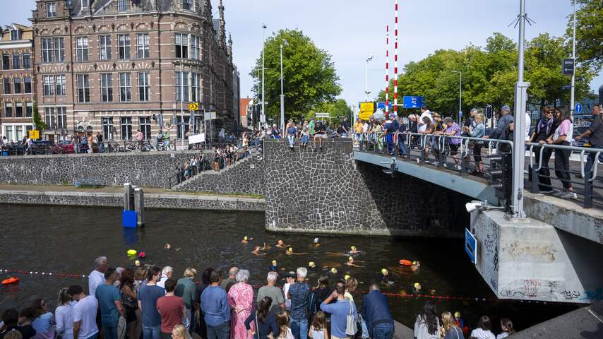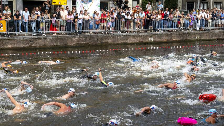 Sommige deelnemers zwommen alleen in badkleding, maar anderen droegen ook wetsuits. De temperatuur van het water van de grachten was zaterdag net boven de 20 graden. | Beeld: ANP