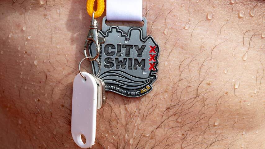 Bij de finish kregen deelnemers een medaille. De Amsterdam City Swim bestaat sinds 2011. Toen begonnen veertien vrienden de actie om geld op te halen voor een vriend van hen die aan ALS leed. | Beeld: ANP