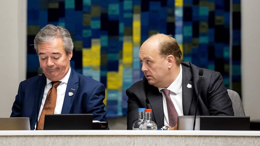 Gedeputeerden Meindert Stolk (links) en Frederik Zevenbergen tijdens de vergadering over Chemours. | Beeld: ANPProvincie controleert Chemours vijftig keer per jaar