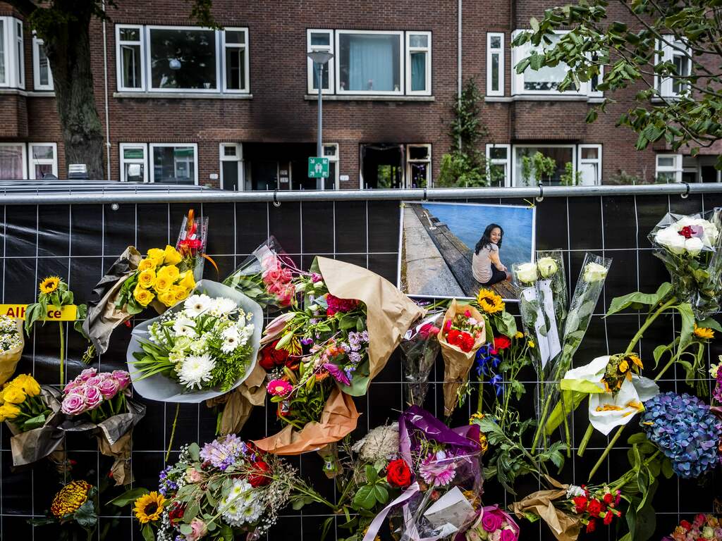 Een dag na de tragische gebeurtenissen in Rotterdam-West zijn er massaal bloemen bij het plein neergelegd. Ook staan er zwarte schermen rond het woningblok.