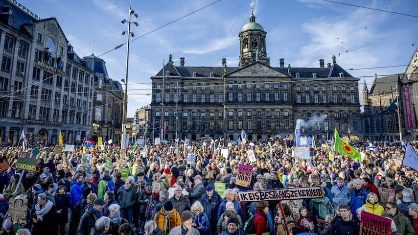 De grote groep verzamelde op De Dam. Om 13.00 uur begonnen de demonstranten zingend en schreeuwend onder begeleiding van muziek, fluitjes en sirenes aan hun route. | Beeld: ANP