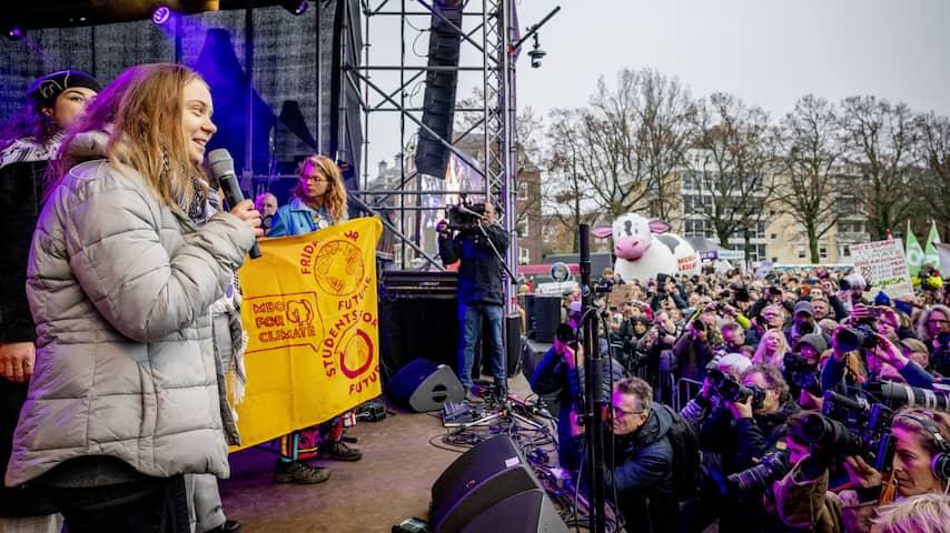 Thunberg liep mee tijdens de klimaatmars en sprak na afloop de menigte toe op het Museumplein. | Beeld: ANP