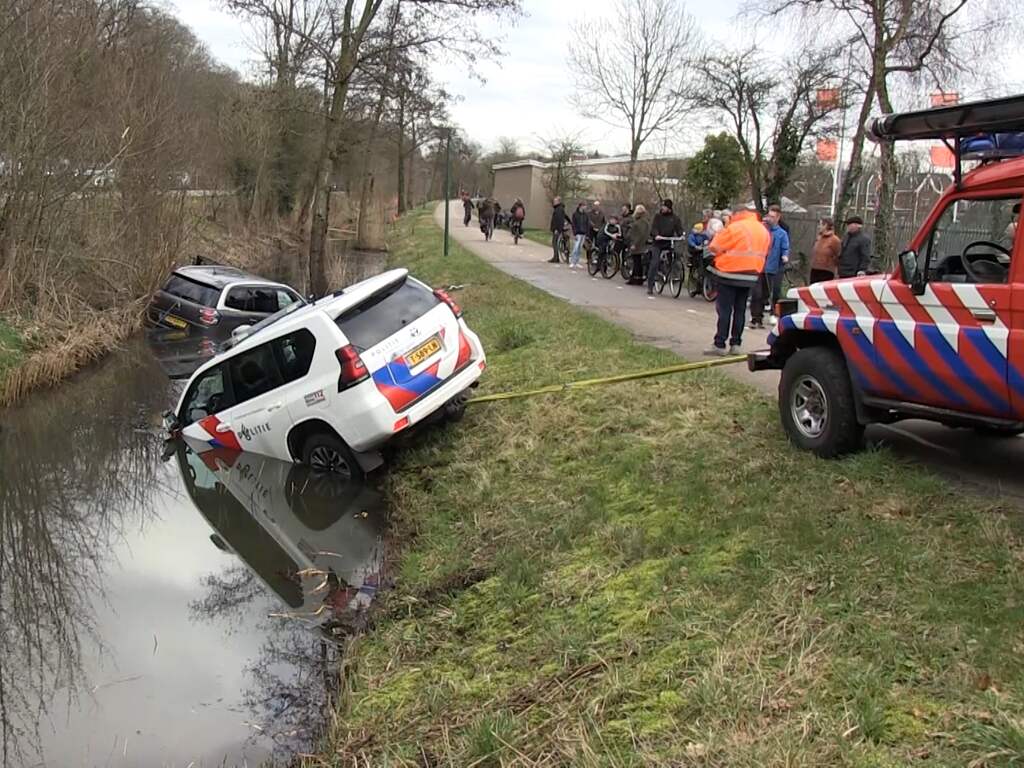 Bij een noodgeval voor een auto in de sloot in Castricum is de uitrukkende politieauto zelf in het water beland. De toegesnelde politieagent was waarschijnlijk de handrem vergeten aan te trekken.