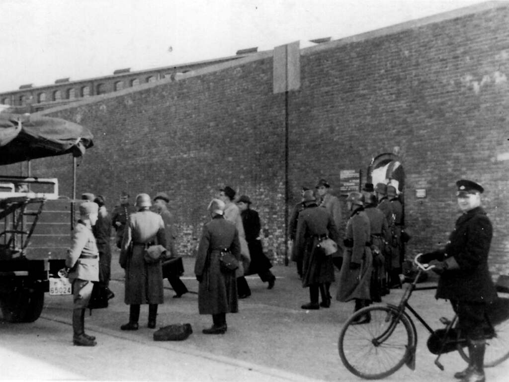 De foto is vlak daarvoor gemaakt door Sara Oversluizen-Kop. Zij was de zus van Geuzen-leider Arij Kop, die op 13 maart 1941 werd gefusilleerd. Oversluizen-Kop kwam die dag naar het Oranjehotel om spullen van haar omgekomen broer op te halen en zag haar andere broer, Leen Kop, als gevangene naar buiten komen.