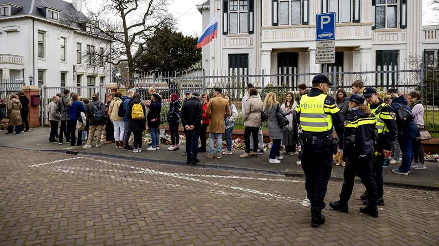 Niet alleen Navalny staat centraal in Den Haag: bij de dranghekken zijn Oekraïense vlaggen opgehangen. Het is inmiddels ruim twee jaar geleden dat Rusland de oorlog in Oekraïne begon. | Beeld: ANP