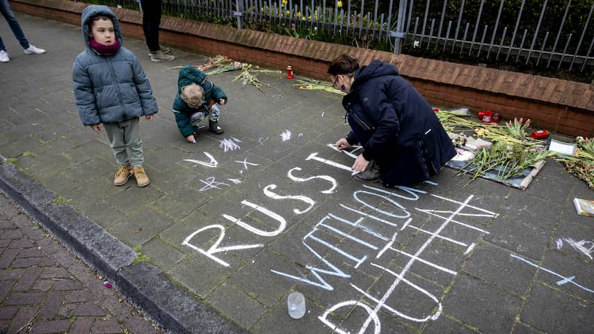 Op de stoep naast de ingang van de ambassade schrijven kinderen met stoepkrijt. 'Russia without Putin', valt te lezen. | Beeld: ANP