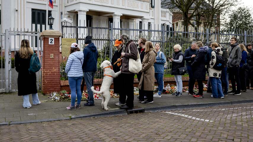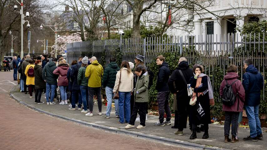 De rij is honderden meters lang en slingert over de Andries Bickerweg, waar de ambassade gevestigd is, en loopt door over de Groot Hertoginnelaan die daarop aansluit. | Beeld: ANP