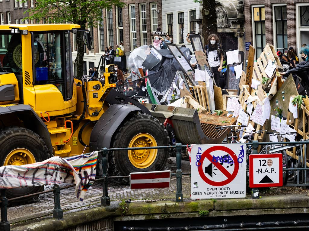 Amsterdam | Een beeld van eerder op de avond, toen de shovel de barricade opruimde. Een deel van het puin werd in de gracht geschoven.