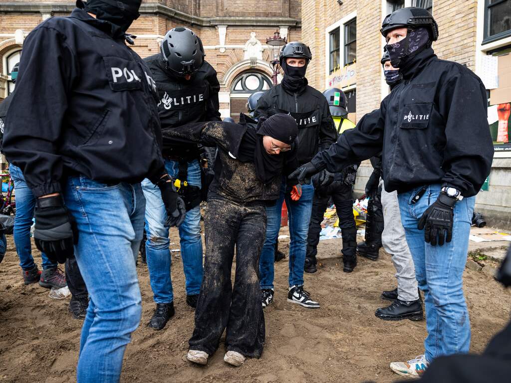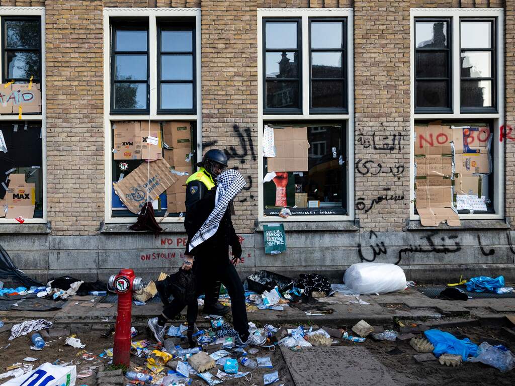 Amsterdam | Een agent haalt een van de laatste betogers van het universiteitsterrein af.