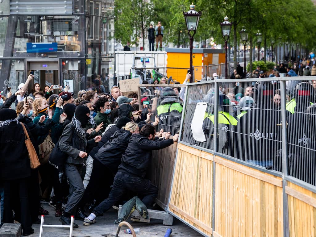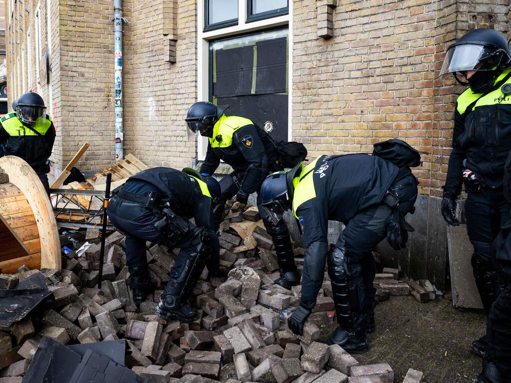 Agenten van de ME hebben zich opgesteld in een linie. Een deel van de betogers marcheert naar de agenten, meldt Het Parool. Daarbij hebben betogers en ME'ers enkele tikken naar elkaar uitgedeeld.