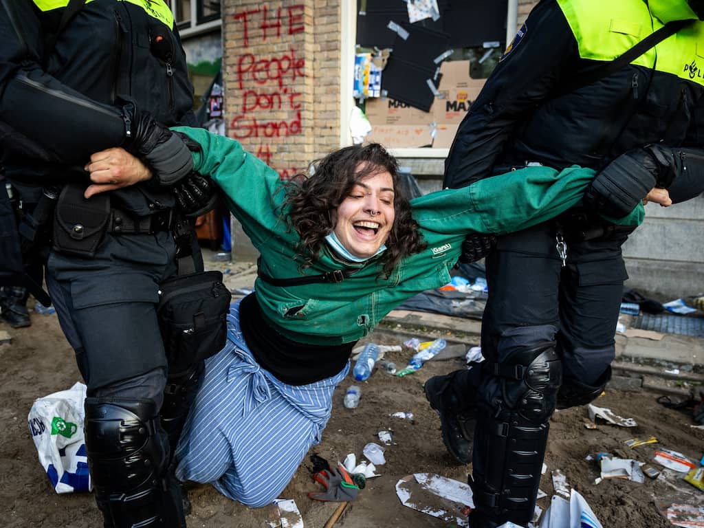 De politie arresteert de eerste betogers, meldt Het Parool. De ME'ers voeren de arrestanten weg onder luid boegeroep van andere demonstranten.