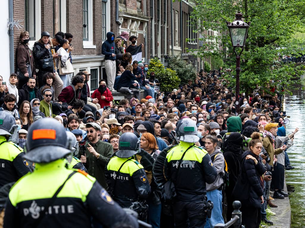 Er zijn honderden mensen aanwezig op het Binnengasthuisterrein in Amsterdam. Veel mensen demonstreren buiten de barricade die demonstranten hebben opgeworpen. De demonstranten houden sjaals en paraplu's omhoog zodat de aanwezige media geen beelden kunnen maken. Ook staan er mensen op het dak en worden pro-Palestijnse leuzen geroepen.