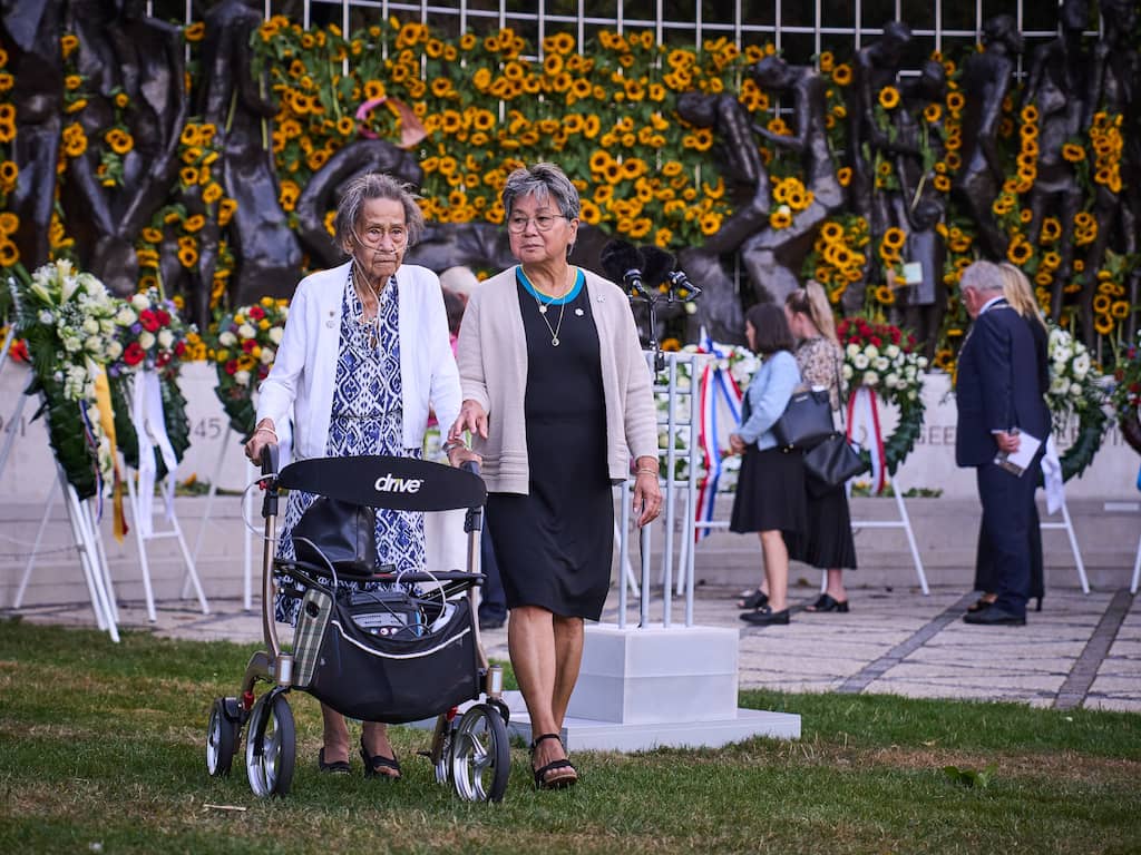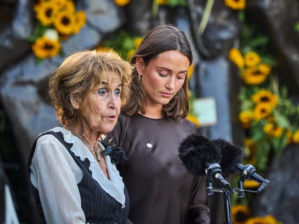 Schrijfster Yvonne Keuls (92) houdt samen met haar kleindochter Babiche een toespraak. Ze vertelt het verhaal van haar schoonvader Aat, die door de Japanners tot krijgsgevangene was gemaakt. Hij was getuige van een executie van krijgsgevangenen die probeerden te vluchten. "De groep werd eerst afgeranseld en toen ze op de grond lagen, werden ze met de bajonetten vermoord", vertelt Keuls. | Beeld: ANP