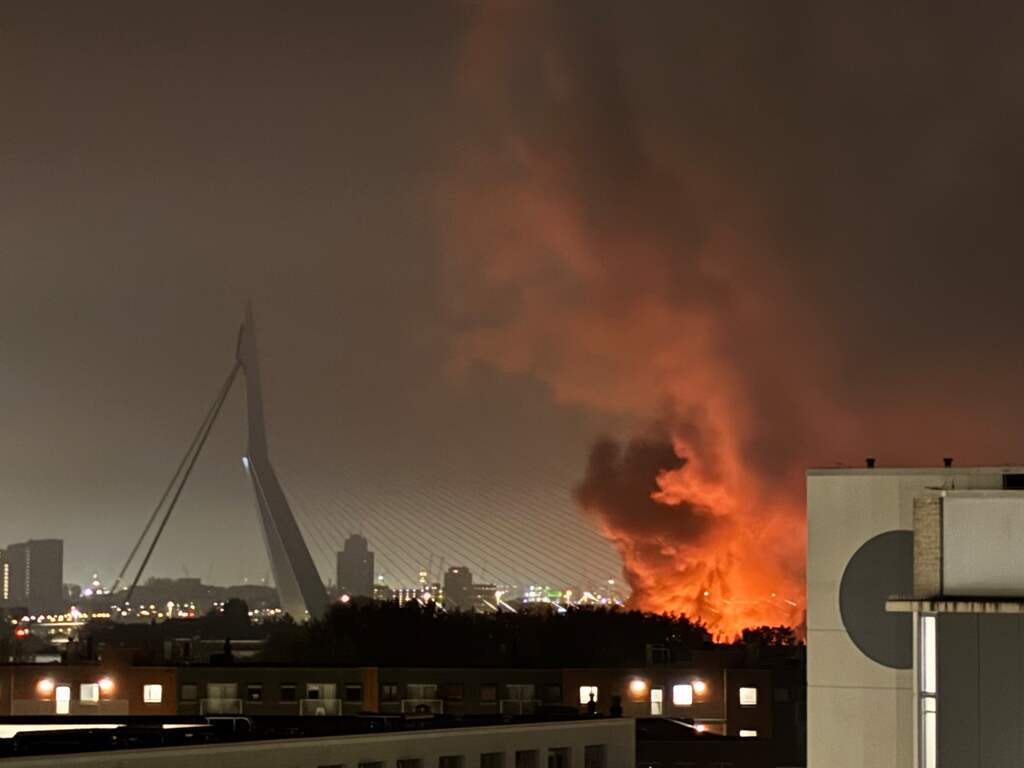 De brand werd rond 3.35 uur opgemerkt. Die leek te ontstaan op de derde etage van een woongebouw op het Noordereiland in de Nieuwe Maas. Kort daarna sloegen de vlammen door het dak naar buiten.