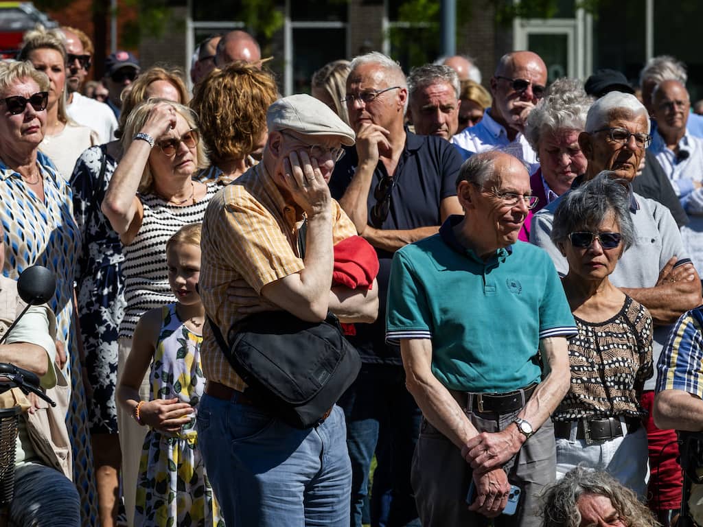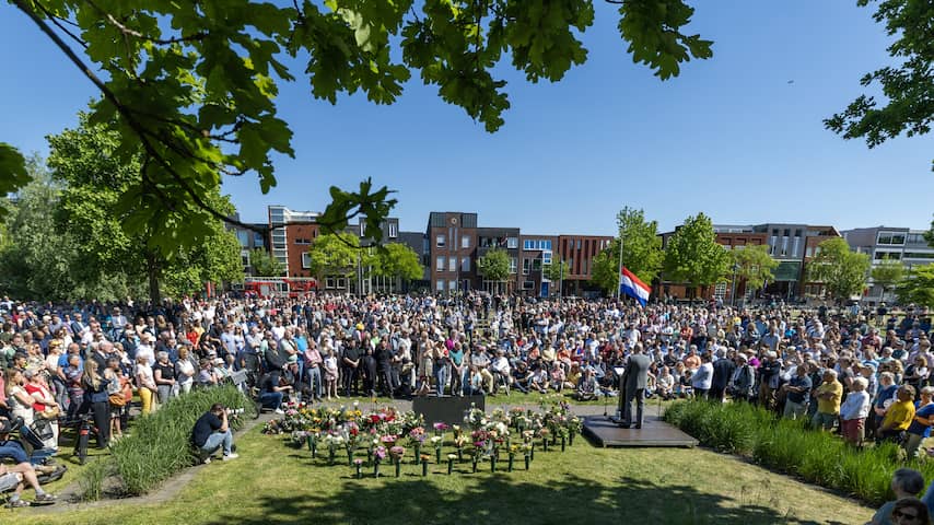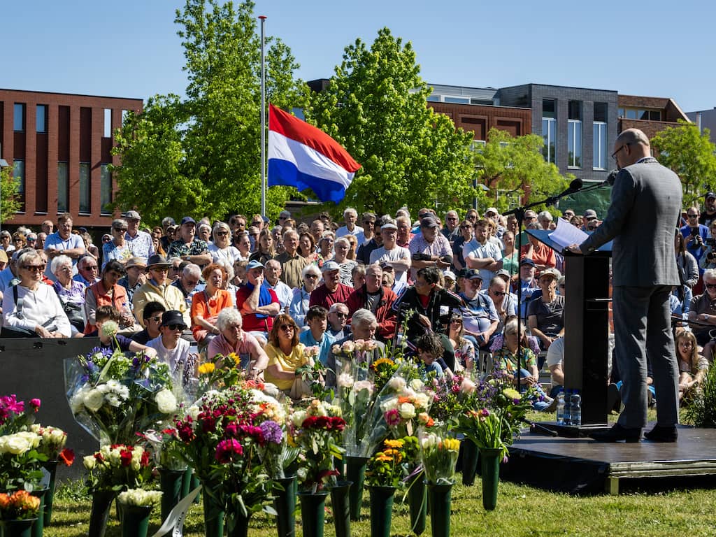 De gemeente schat dat er tussen de duizend en vijftienhonderd mensen bij de herdenking waren. De burgemeester zei na afloop dat het een stuk drukker was dan voorgaande jaren. "Ik hoorde zelfs iemand die vanuit Limburg hiernaartoe kwam." | Beeld: ANP