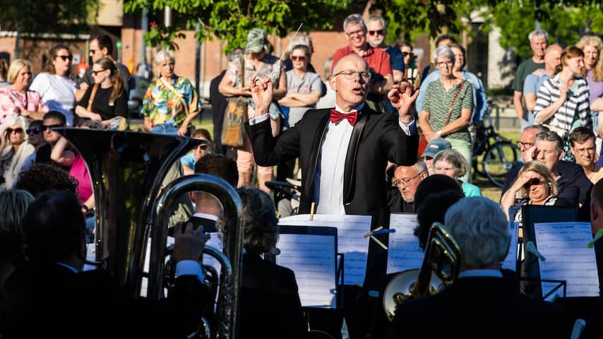 Fanfareorkest De Bazuin houdt een herdenkingsconcert op de plek van de vuurwerkramp in de wijk Roombeek. | Beeld: ANP