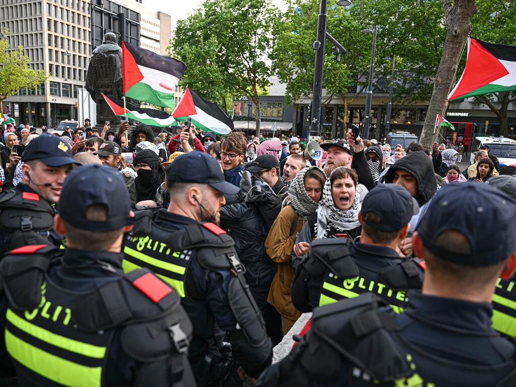 Bij een pro-Palestijnse demonstratie in Rotterdam is woensdagavond een agent mishandeld. In totaal zijn 93 mensen aangehouden. Meer dan de helft van hen zit donderdagochtend nog vast. De meesten worden in de loop van de dag vrijgelaten.