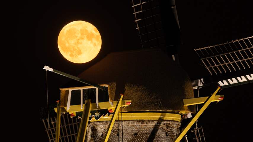 NU.nl-lezer Cor maakte deze foto van de maan boven een molen in Hoofddorp, waar de maan iets meer de kleur van een citroen had. | Beeld: Cor Meenderinck